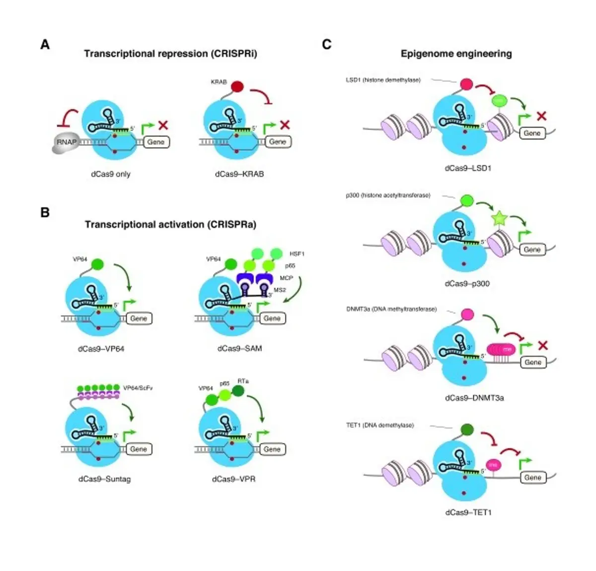 Image credit: Lo, A. & Qi, L. (2017). Genetic and epigenetic control of gene expression by CRISPR-Cas systems. F1000Res. 6.
